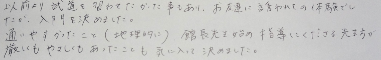 良いところにもあげたように、人間教育に力を入れて、指導をしているところ。特に始めに道場訓を唱和し大きな声で挨拶ができるようにするところから、スタートすることに、とても感動したから。
